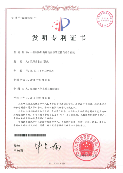 兴创嘉科技【发明】一种制备铝电解电容器的双槽自动含浸机